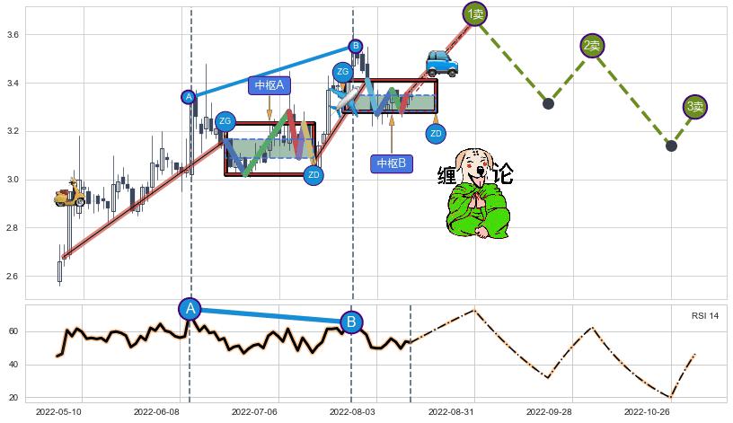 ➢ 【中枢B】:2022-08-01-2022-08-11,中枢由5笔构成,共9交易日, ZG=3.350, ZD=3.280