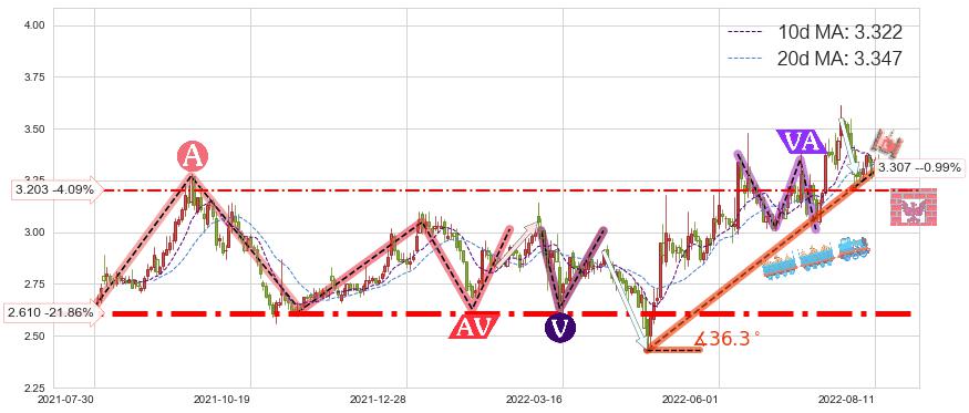 🍖 长线趋势跟踪组合短线均值回复[强支撑信号]2022-04-26-2022-08-02上升趋势依然成立(上涨趋势跟踪依然可行),短线价格略微下行回调(均值回复猜想),即将接近趋势提供的未破位的支撑价格:3.307。