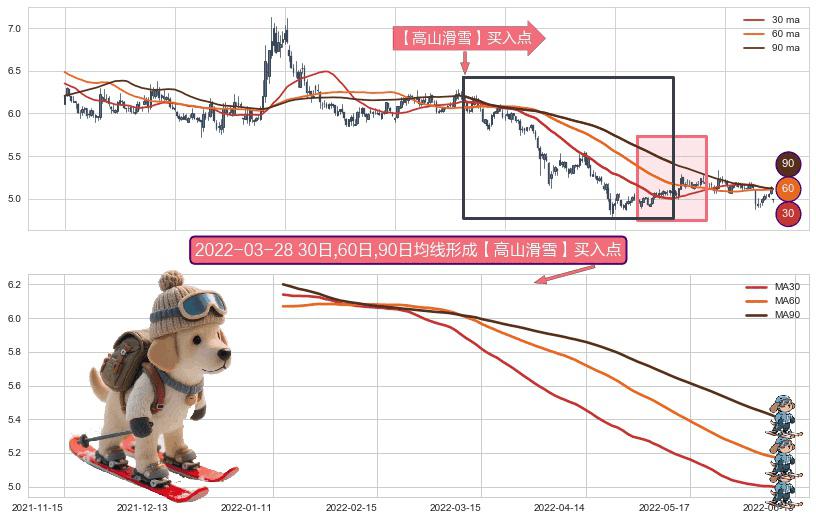 ⚀ 2022-01-13日-2022-06-09日显现 30日-60日-90日均线 【高山滑雪】买入点 看多信号,后市看涨,买入