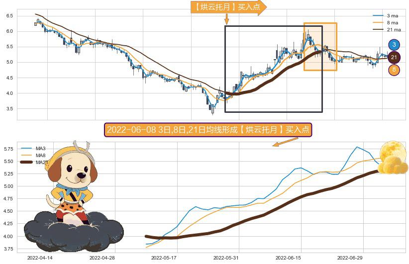 ⚀ 2022-05-10日-2022-07-05日显现 3日-8日-21日均线 【烘云托月】买入点 看多信号,后市看涨,买入