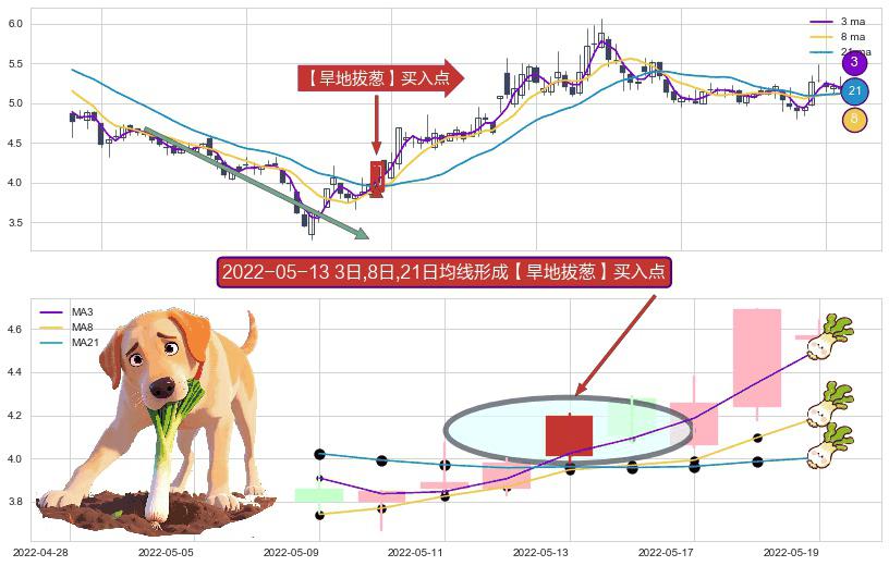 ⚀ 2022-05-13日显现 3日-8日-21日均线 【旱地拔葱】买入点 看多信号,后市看涨,买入