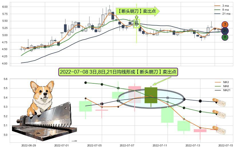 ⚀ 2022-07-08日显现 3日-8日-21日均线 【断头铡刀】卖出点 看空信号,后市看跌,卖出