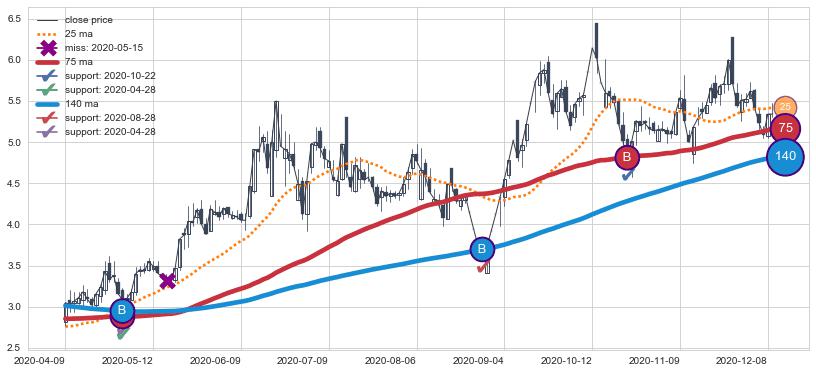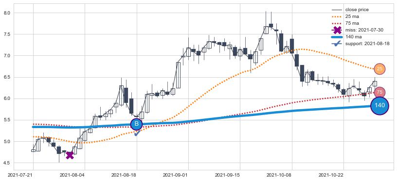 ⚁ MA3和MA8走势平行,且始终保持在短距离内,MA21始终在短中期均线下方,与短中期均线保持一定的距离,微微上行