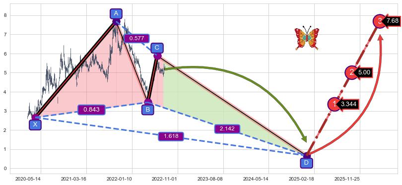 ➣ 未完成【蝴蝶】形态起点X: 2020-04-03, 已到达C点: 2022-06-28, 预测最终D点: 2025-01-01, 共1186交易日