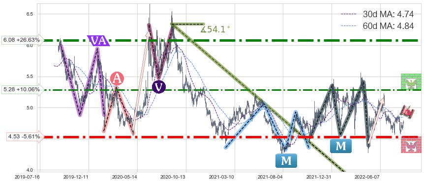 ♞ 30日均线:4.74,60日均线:4.84→ 快线<慢线