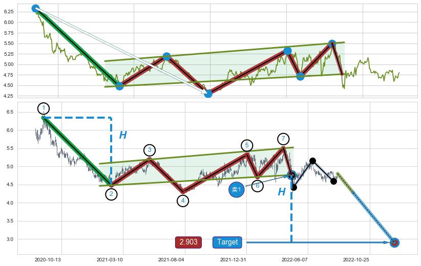 ➣ 最小中继整理跌幅→𝐇: 1.2000 (上平行阻力线与下平行支撑线的垂直距离)