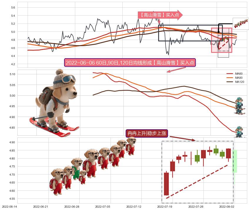 | 4 🅚:上涨两颗星 | 上涨三颗星 ➕ 🎢:【高山滑雪】买入点均线组合买入点信号形成后,猜想后续下行结束,持续反弹上涨(均值回复) ☞ 看多信号 ⇥ 【均线】交织【🅚线】⇥ 综合量化分数: 54 | > |
