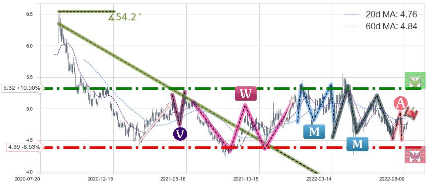 ➣ 【仅预测突破】最后价格:4.80与预测突破价格:4.61→【空间中等】后续最小【整理】第一目标价格→(2022-10-04: 3.578 )