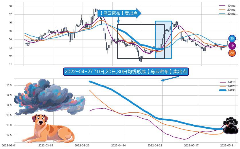 形态多维评估: ⚀ 2022-03-29日-2022-05-27日显现 10日-20日-30日均线 【乌云密布】卖出点 看空信号,后市看跌,卖出