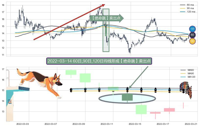 形态多维评估: ⚀ 2022-03-14日显现 60日-90日-120日均线 【绝命跳】卖出点 看空信号,后市看跌,卖出