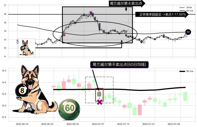 形态多维评估: ⚀ 2022-07-06-日显现 葛兰威尔均线 60日均线 第⑧卖出点 下降趋势的中继信号,后市看跌,卖出信号