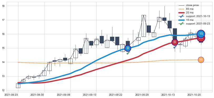 上涨趋势2021-08-23-2021-10-20,均线25, 15确认关键支撑2处