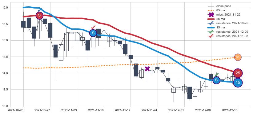 下跌趋势2021-10-20-2021-12-15,均线25, 15确认关键阻力3处