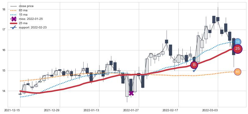 上涨趋势2021-12-15-2022-03-09,均线25确认关键支撑1处