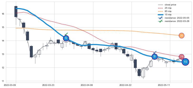 下跌趋势2022-03-09-2022-05-16,均线15确认关键阻力2处