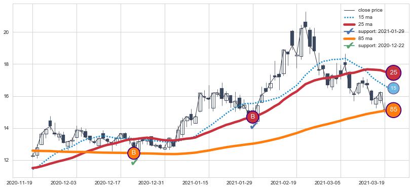 上涨趋势2020-11-19-2021-03-22,均线25, 85确认关键支撑2处