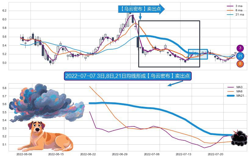 ⚀ 2022-06-21日-2022-07-22日显现 3日-8日-21日均线 【乌云密布】卖出点 看空信号,后市看跌,卖出