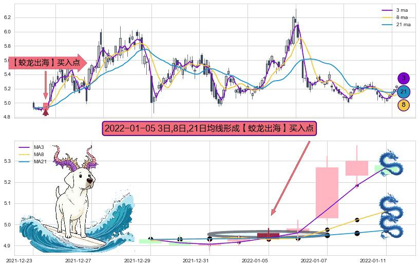 ⚀ 2022-01-05日显现 3日-8日-21日均线 【蛟龙出海】买入点 看多信号,后市看涨,买入