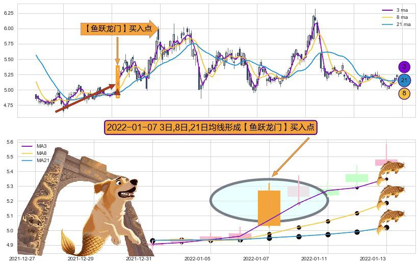 ⚀ 2022-01-07日显现 3日-8日-21日均线 【鱼跃龙门】买入点 看多信号,后市看涨,买入
