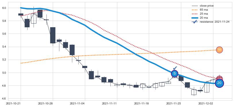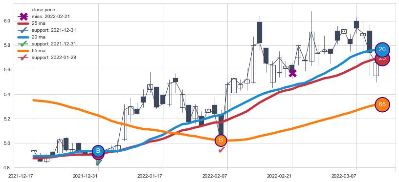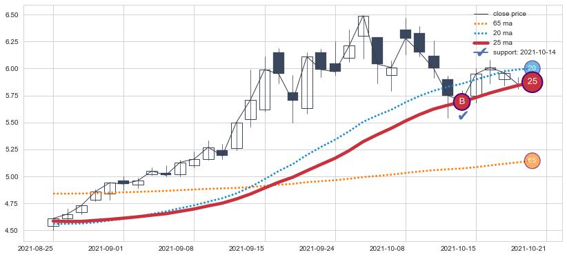 ⚁ MA3和MA8走势平行,且始终保持在短距离内,MA21始终在短中期均线上方,与短中期均线保持一定的距离,微微下行