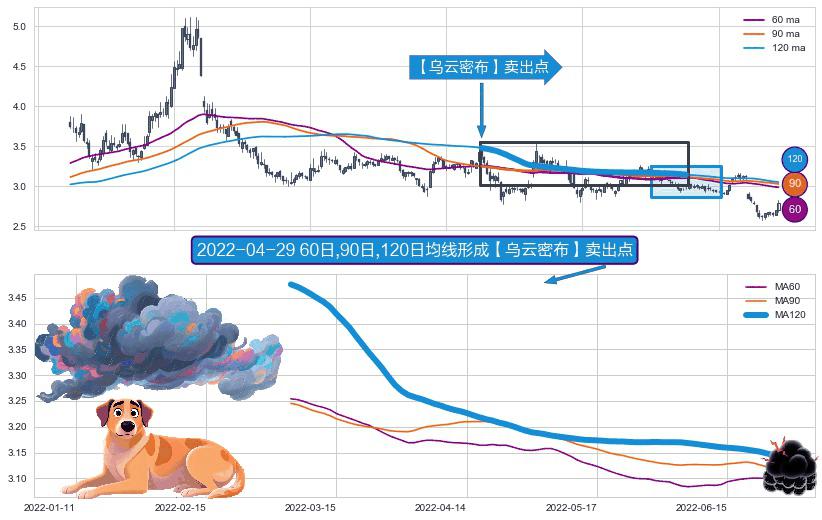 ⚀ 2022-03-04日-2022-06-27日显现 60日-90日-120日均线 【乌云密布】卖出点 看空信号,后市看跌,卖出