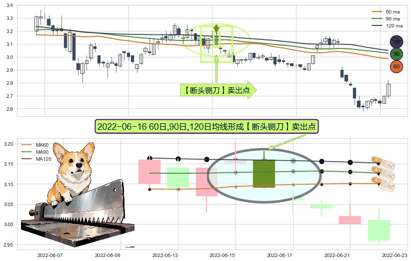 ⚀ 2022-06-16日显现 60日-90日-120日均线 【断头铡刀】卖出点 看空信号,后市看跌,卖出