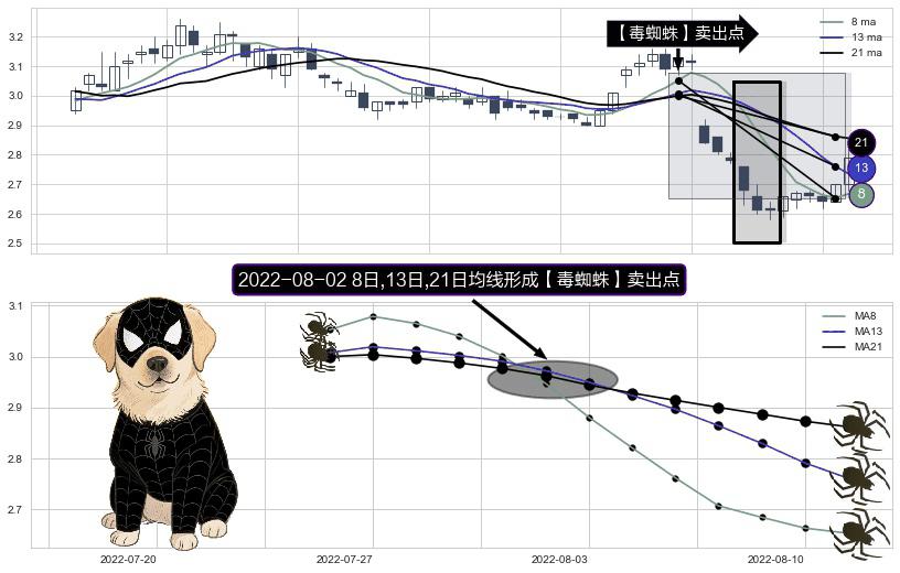 ⚀ 2022-08-02日显现 8日-13日-21日均线 【毒蜘蛛】卖出点 看空信号,后市看跌,卖出