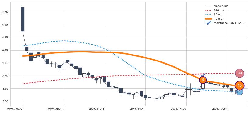 ⚀ 2021-12-10-日至2022-03-23-日显现 60日-90日-120日均线 【死亡谷】卖出点 看空信号,后市看跌,卖出