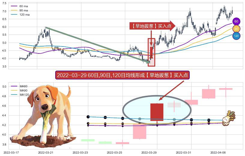 形态多维评估: ⚀ 2022-03-29日显现 60日-90日-120日均线 【旱地拔葱】买入点 看多信号,后市看涨,买入