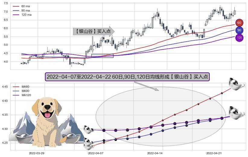 形态多维评估: ⚀ 2022-04-08-日至2022-04-22-日显现 60日-90日-120日均线 【银山谷】买入点 看多信号,后市看涨,买入