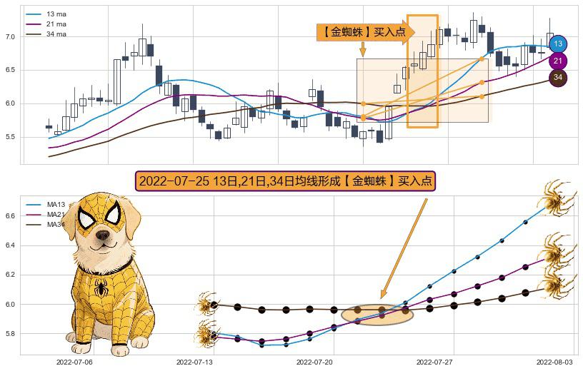 形态多维评估: ⚀ 2022-07-25日显现 13日-21日-34日均线 【金蜘蛛】买入点 看多信号,后市看涨,买入