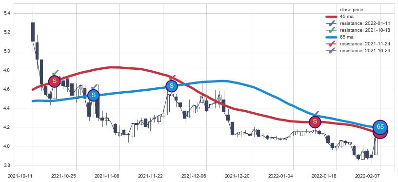 下跌趋势2021-10-11-2022-02-07,均线65, 45确认关键阻力4处