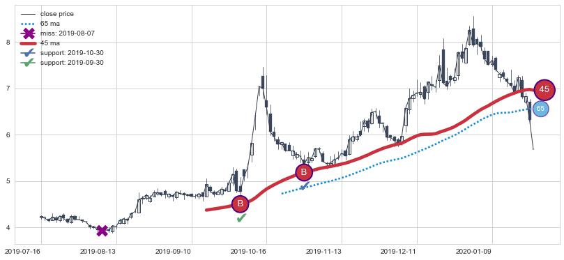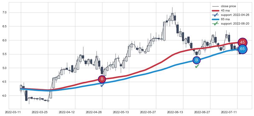 上涨趋势2022-03-11-2022-07-12,均线65, 45确认关键支撑2处