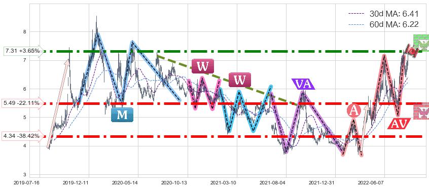 ➣ 【已确认突破】最后价格:7.05与最小【反转】第一目标价格→(2022-09-13: 7.81 )相较: 上涨空间【中等】