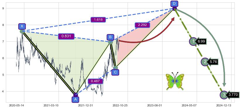 ➣ 未完成【蝴蝶】形态起点X: 2020-04-23, 已到达C点: 2022-07-15, 预测最终D点: 2023-11-07, 共874交易日