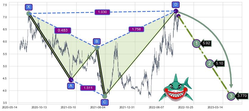 ➣ 已完成【鲨鱼】形态起点X: 2020-07-09, 终点D: 2022-08-01, 共502交易日