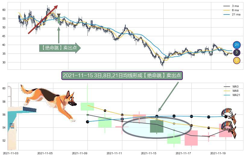 ⚀ 2021-11-15日显现 3日-8日-21日均线 【绝命跳】卖出点 看空信号,后市看跌,卖出