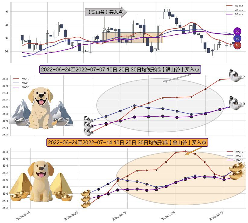⚃ 2022-06-27-日至2022-07-14-日显现 10日-20日-30日均线 【金山谷】买入点 其再次确认了买入信号,可靠性更强,买入