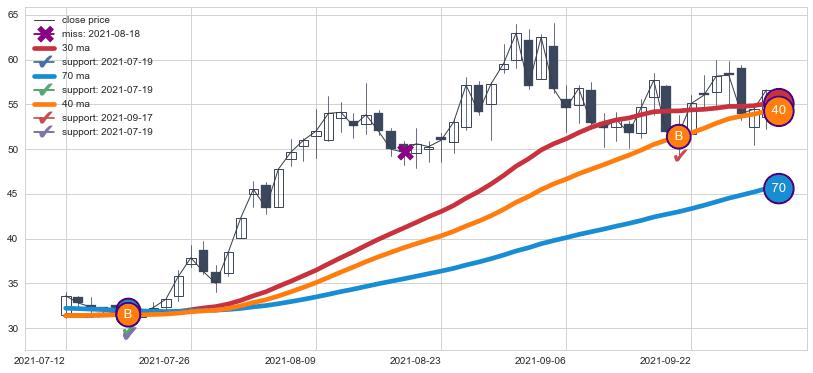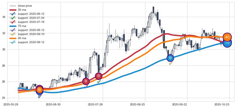 ➢ 最优均线组合共正确确认支撑阻力信号7处,正确确认率 50.00%