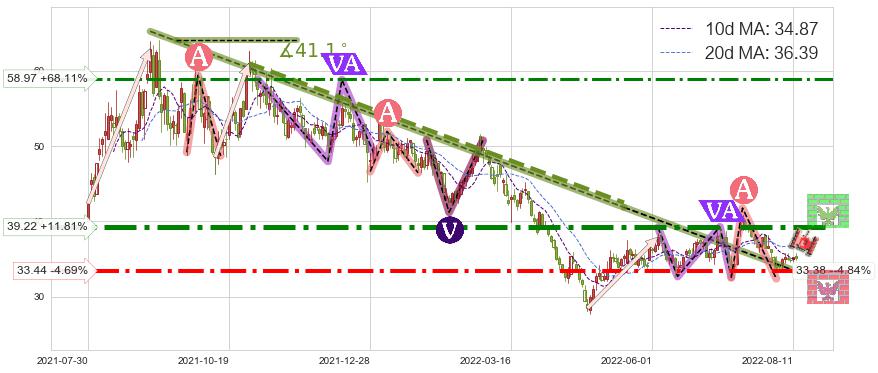 ♘ 阻力价格位39.22,可信任强度88.03%,距离最后交易2022-08-12形成的收盘价格35.08相差 +11.81%