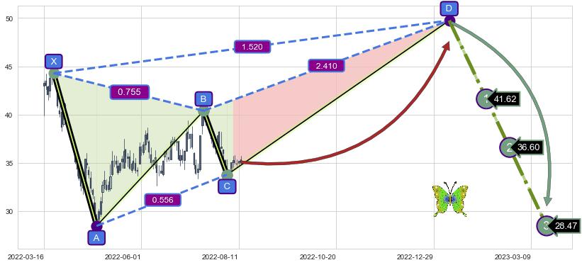 ➣ 未完成【蝴蝶】形态起点X: 2022-03-23, 已到达C点: 2022-08-03, 预测最终D点: 2023-01-10, 共200交易日