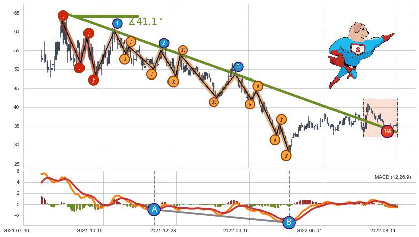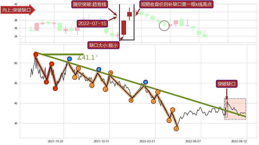 ➢ 2021-08-31-2022-05-18下跌趋势存在反转上涨[机会],虽然原下跌趋势的阻力位(33.38)已被突破,但其阻力效果尚存,原下跌趋势角度: 41.1˚