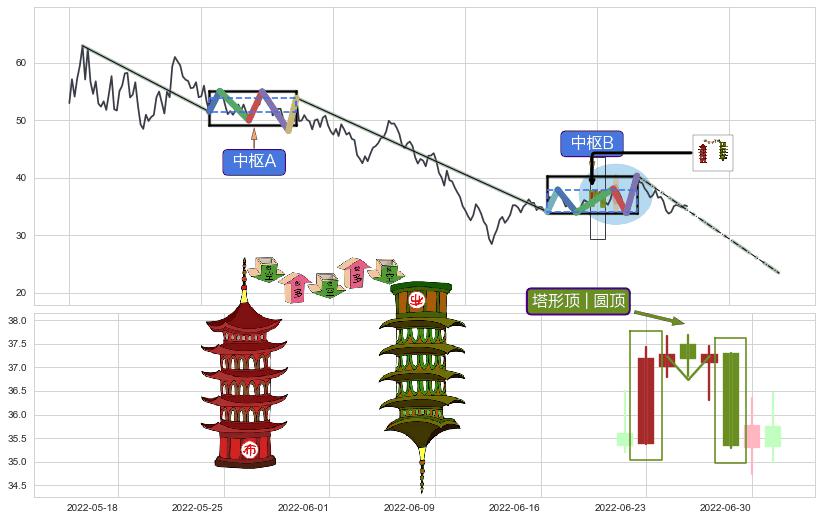 ➢ 【中枢B】:2022-05-30-2022-07-18,中枢由6笔构成,共35交易日, ZG=37.94, ZD=34.10
