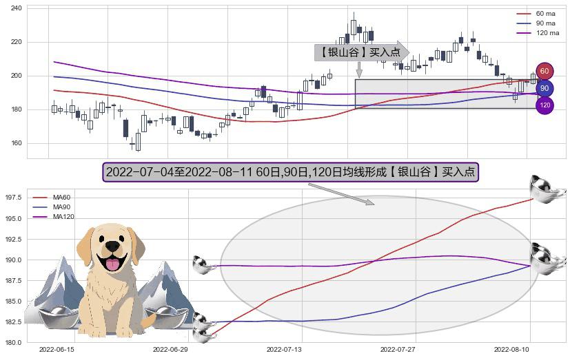 ⚀ 2022-07-05-日至2022-08-11-日显现 60日-90日-120日均线 【银山谷】买入点 看多信号,后市看涨,买入