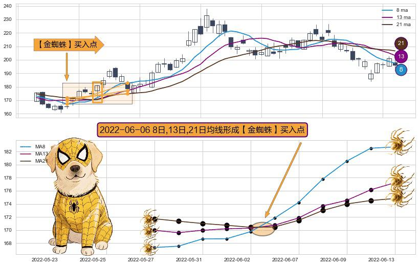 ⚀ 2022-06-06日显现 8日-13日-21日均线 【金蜘蛛】买入点 看多信号,后市看涨,买入
