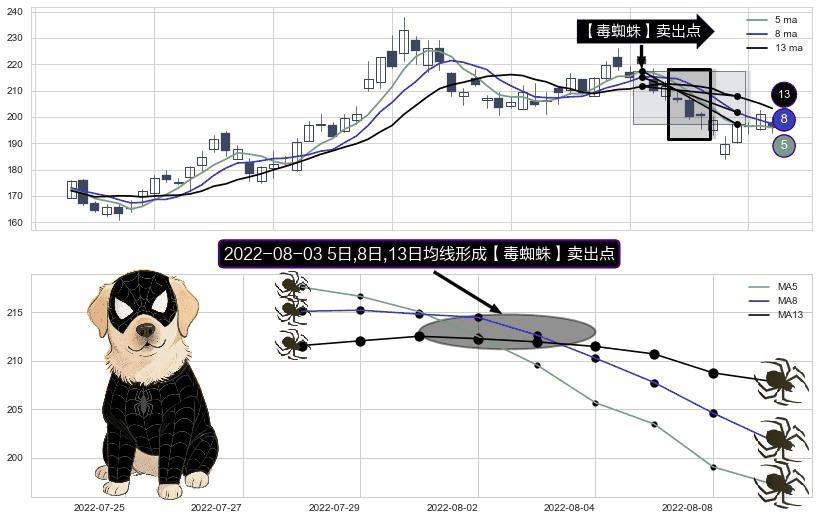⚀ 2022-08-03日显现 5日-8日-13日均线 【毒蜘蛛】卖出点 看空信号,后市看跌,卖出