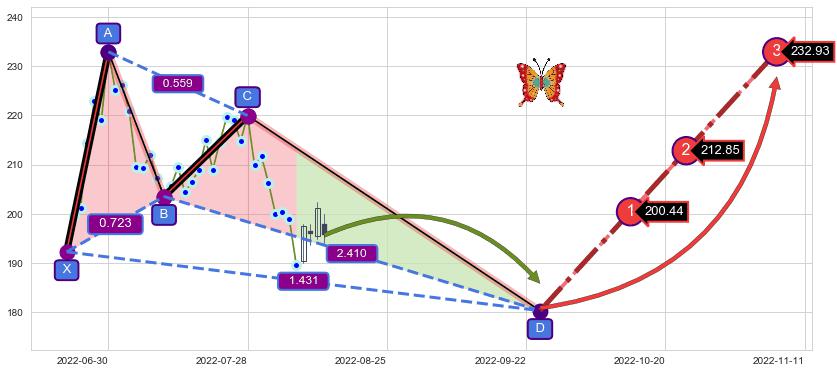 ➣ 未完成【蝴蝶】形态起点X: 2022-06-22, 已到达C点: 2022-07-28, 预测最终D点: 2022-09-26, 共65交易日