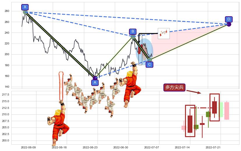 ➣ D点拟合预测价格255.79,距离最后交易收盘价格195.66相差 +30.73%