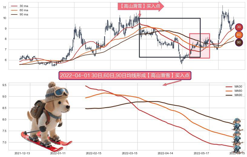 形态多维评估: ⚀ 2022-01-26日-2022-06-07日显现 30日-60日-90日均线 【高山滑雪】买入点 看多信号,后市看涨,买入