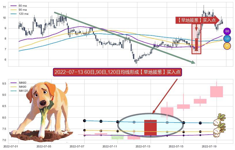 形态多维评估: ⚀ 2022-07-13日显现 60日-90日-120日均线 【旱地拔葱】买入点 看多信号,后市看涨,买入